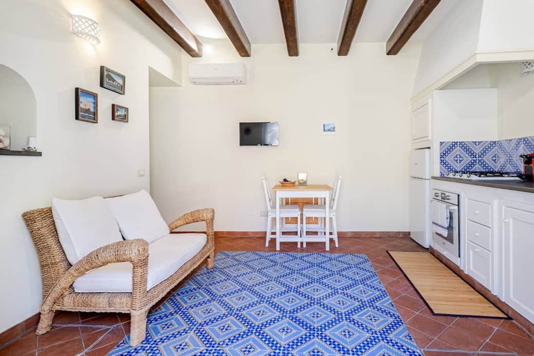 L’ingresso diretto dalla piazzetta conduce a un accogliente soggiorno con cucina in stile eoliano, impreziosita da piano in pietra lavica e maioliche tradizionali. La camera matrimoniale è silenziosa e confortevole, ideale per un riposo rigenerante dopo una giornata tra mare e passeggiate.